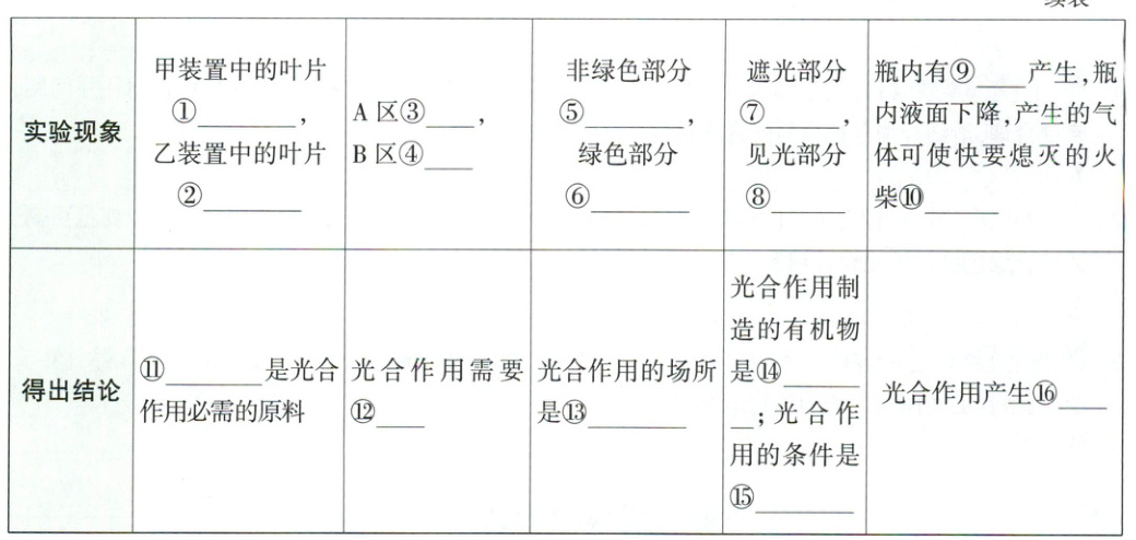 ①不变蓝 ②变蓝 ③变蓝 ④不变蓝 ⑤不变蓝 ⑥变蓝 ⑦不变蓝 ⑧变蓝 ⑨气泡 ⑩复燃 ⑪二氧化碳 ⑫水 ⑬叶绿体 ⑭淀粉 ⑮光(或光照) ⑯氧气