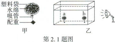 小组同学自制了两个相同的“水绵伞”(透明塑料袋中装满水和水绵),调整配重能将其直立于水底,将两个“水绵伞”置于离光源距离不同的水底(如图),一段时间后观察实验现象,下列说法错误的是(