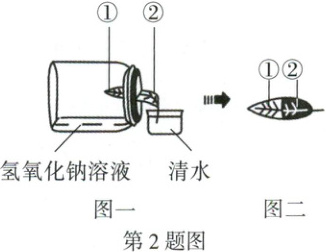 2. (2025河北14题)将某植物放在黑暗处一昼夜,取一片叶进行处理,如图一所示。将装置置于光下一段时间,取出叶,经脱色、漂洗、滴加碘液,观察到叶片①处不变蓝,②处变蓝,如图二所示。该实验验证了光合作用的原料是(