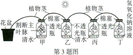 3. (2025石家庄一模)如图是生物小组探究植物光合作用的实验装置,取同一棵植物茎上的叶片,将其分别放入甲、乙、丙、丁四个瓶中,氢氧化钠溶液可以吸收二氧化碳。下列分析错误的是(