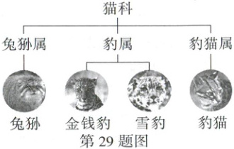 (3)保护区内除雪豹和兔狲外,还有金钱豹和豹猫等猫科动物,图中最小的分类等级是____,其中亲缘关系最近的是____。