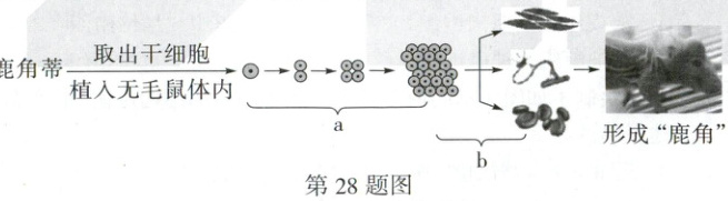 28. (7分)我国科学家将鹿的干细胞移植到无毛鼠头部皮下仅45天,无毛鼠的前额便长出树桩状的“鹿角”,如图表示“鹿角”的形成过程,图中a、b表示细胞的生理过程,回答下列问题。