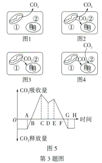 3. (2025 保定二模) 如图 1 到图 4 为大豆叶肉细胞内二氧化碳利用情况示意图(二氧化碳化学表达式为$CO_{2}$,①②表示细胞内两种能量转换器),图 5 是大豆植株 24 小时内二氧化碳吸收量的变化曲线,下列有关叙述正确的是 (