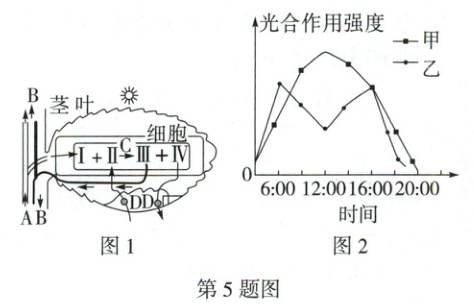 5. (2025 邯郸二模) 2022 年 4 月 18 日,国家植物园在北京正式揭牌。下图中图 1 是园内某被子植物进行光合作用示意图。图中箭头表示物质运输方向,代码Ⅰ、Ⅱ、Ⅲ、Ⅳ表示物质,字母 A、B、C、D 表示结构。图 2 是园内另外两种植物甲、乙叶片的光合速率在某一时间段的变化曲线。据图分析回答下列问题。