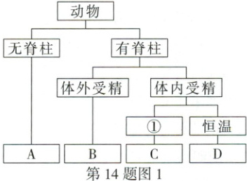 14. (2025 吉林改编)对生物进行分类可以更好地了解生物的多样性。现有蟾蜍、草原雕、蝴蝶和蜥蜴四种生物,请按图 1 对其进行分类并回答问题。
