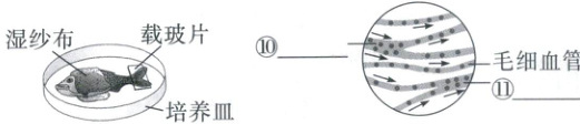 注意事项:选取尾鳍色素⑫_的小鱼,用⑬_倍镜观察小鱼尾鳍内血液流动情况;实验过程中每隔几分钟用滴管向纱布上滴水,保持湿润,使小鱼少受伤害。实验后立即将小鱼放回水中
