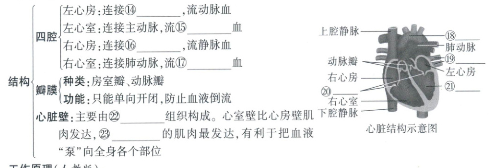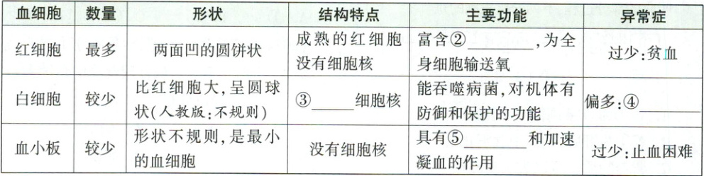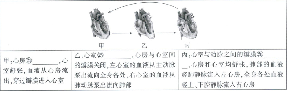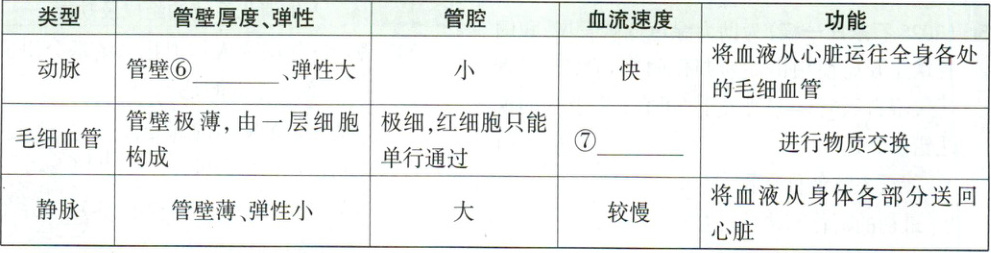 考点梳理 ①血细胞 ②血红蛋白 ③有 ④炎症 ⑤止血 ⑥厚 ⑦最慢 ⑧红细胞 ⑨一 ⑩动脉 ⑪静脉 ⑫少 ⑬低 ⑭肺静脉 ⑮动脉 ⑯上、下腔静脉 ⑰静脉 ⑱主动 脉 ⑲肺静脉 ⑳房室瓣 ㉑左心室 ㉒肌肉 ㉓左心 室 ㉔收缩 ㉕收缩 ㉖关闭