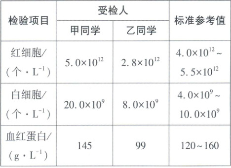 2. (2025 邯郸二模) 下表是血常规化验单中两位同学的部分数据,相关说法错误的是 (