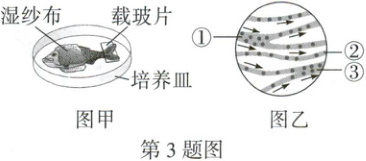 3. (2025 唐山二模改编) 图甲为“观察小鱼尾鳍内的血液流动”的实验材料,图乙为显微镜下观察到的图像,①②③表示血管。下列叙述错误的是 (
