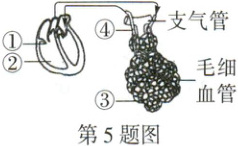 5. (2024 河北 14 题) 如图为肺循环示意图,箭头表示血流方向,①②③④表示结构。下列说法错误的是 (