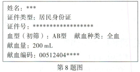 8. (2025 石家庄模拟) 无偿献血是一项有积极意义的社会公益活动。如图为某志愿者的献血证(部分),下列正确的是 (