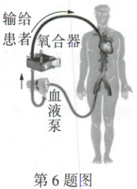 6. 教材新增素材 (2025 石家庄模拟) 医生在抢救呼吸衰竭的急危重症患者时,使用某种体外膜氧合器(俗称“人工肺”)的急救设备,其工作原理如图(血液泵将患者的血液泵入氧合器,再输回到上腔静脉中)。下列相关说法正确的是 (