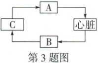 3. 万唯原创 2025 河北新变化 建模思维 如图为血液循环相关示意图,A、B、C 表示血管,其中 A、B 与心脏直接相连,下列叙述正确的是(
