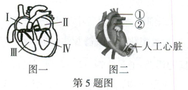 5. (2025 聊城改编)2025 年 4 月,某心衰患者被成功植入了磁悬浮人工心脏,术后第五天生命体征平稳并转入康复病房。如图是人工心脏协助心脏工作的示意图。