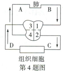 4. 万唯原创 人体是一个统一的整体,物质在体内的运输与循环系统有着密切的关系。如图是人体血液循环简图,图中 A、B、C、D 表示不同的血管,1、2、3、4 表示心脏各腔,请据图回答问题。