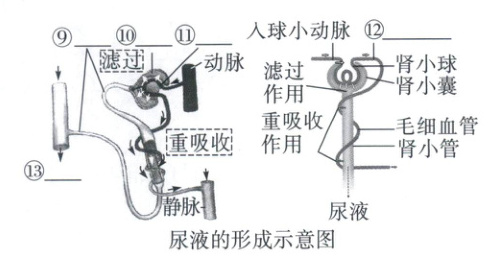 ⑨肾小管 ⑩肾小囊 ⑪肾小球 ⑫出球小动脉 ⑬尿液 ⑭血细胞 ⑮肾小囊 ⑯肾小管 ⑰葡萄糖 ⑱尿素 ⑲输尿管 ⑳尿道