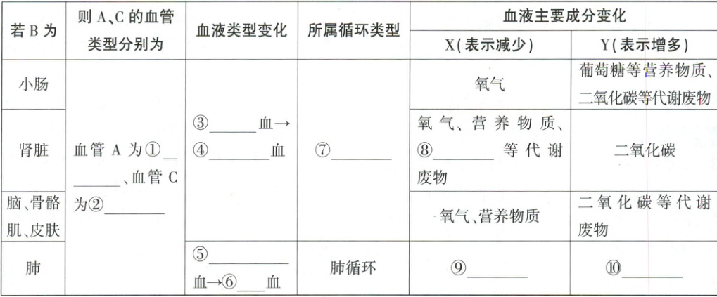 ①动脉 ②静脉 ③动脉 ④静脉 ⑤静脉 ⑥动脉⑦体循环 ⑧尿素 ⑨二氧化碳 ⑩氧气