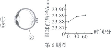 6. (2025石家庄一模)眼是人体获取外界信息的重要结构。科研人员请视力正常的成年志愿者在弱光照下阅读,测定阅读0分钟、阅读30分钟和阅读60分钟时眼球前后径,结果如图所示。下列说法错误的是 (