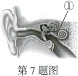 7. (2025河北23题)耳石症是一种内耳平衡功能障碍疾病,患者转头或翻身时会发生剧烈眩晕。如图为人耳结构示意图,①表示结构。耳石症是①中的耳石脱落进入半规管引发的,可通过复位治疗。①表示的是 (