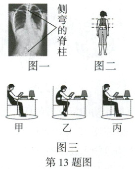 13. (2025河北26题)近年来,河北对全省中小学生开展脊柱侧弯专项筛查。图一为某脊柱侧弯患者的射线透视图像,图二为某种脊柱侧弯筛查姿势示意图,图三为3种不同坐姿示意图。