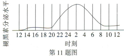 11. (2025石家庄一模)褪黑素是一种可调整睡眠的激素。如图是人体一昼夜(当日12时至次日12时)褪黑素分泌水平图,研究表明蓝光对褪黑素分泌有较强的抑制作用。下列说法错误的是 (
