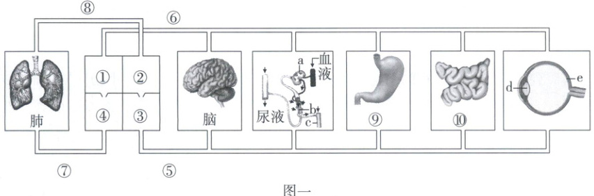 同学们根据科室划分小组,开展志愿服务活动,包括协助老人、清洁科室环境等工作。下面是人体血液循环部分示意图,①~④表示心脏的四个腔,⑤~⑧表示血管,⑨和⑩表示血液流经的器官;a~e 表示人体相关结构。