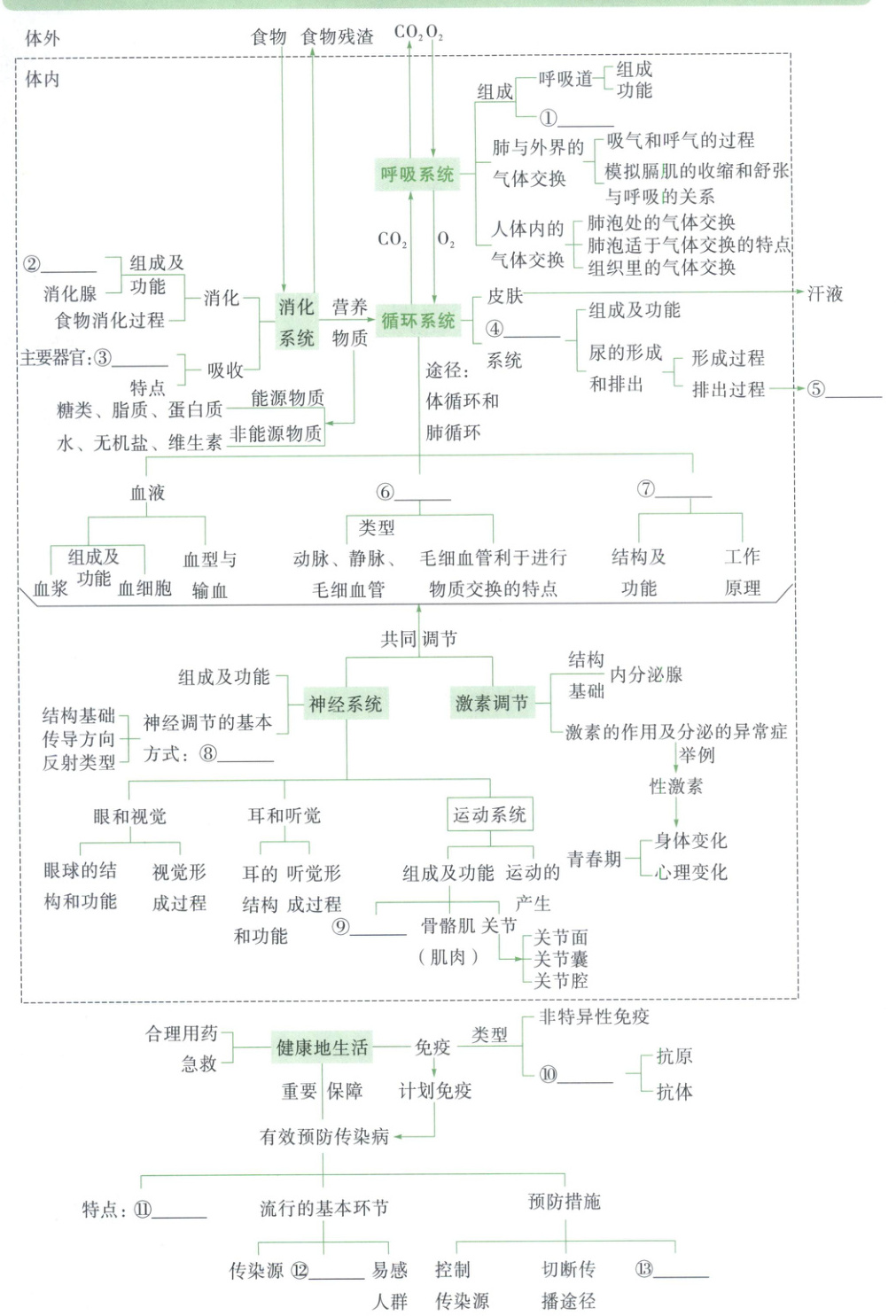 ①肺 ②消化道 ③小肠 ④泌尿 ⑤尿液 ⑥血管 ⑦心脏 ⑧反射 ⑨骨 ⑩特异性免疫 ⑪传染性和流行性 ⑫传播途径 ⑬保护易感人群 “一境到底”练考点 健康行动——守