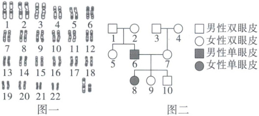 万唯原创 眼皮是一种遗传表型,有单眼皮、双眼皮两种性状表现,它是由父母遗传所决定的。图一是某家族一新生儿体细胞内的染色体排序图,图二是该家族单双眼皮的遗传系谱图(相关基因用 B、b 表示)。请据图回答下列问题。