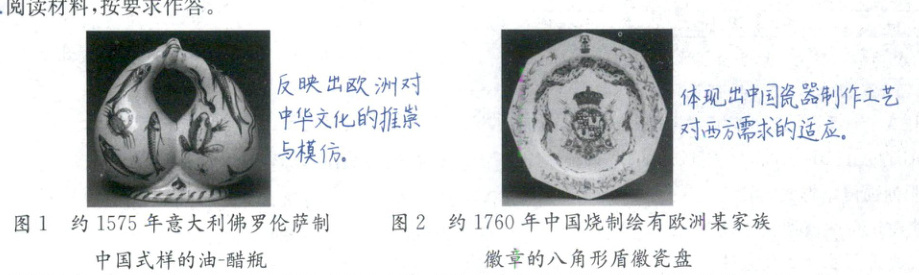 阐述:16—18世纪,随着新航路的开辟,世界逐渐从分散走向整体,中外交流与互动日益频繁。新航路开辟后,东西方之间的贸易通道被打通,大量的中国商品流入欧洲。中国的瓷器以其精美的工艺、细腻的质地和独特的艺术风格,深受欧洲人的喜爱。意大利佛罗伦萨制作的中国式样的油-醋瓶,反映出欧洲对中华文化的推崇与模仿。中国的艺术风格和审美观念开始影响欧洲的工艺美术,为欧洲的艺术创作带来了新的灵感。中国烧制的绘有欧洲某家族徽章的八角形盾徽瓷盘,体现了中国瓷器制作工艺对西方需求的适应。随着欧洲人的订单增多,中国的工匠们开始了解并融入西方的文化符号,以满足欧洲市场的需求。这种交流不仅促进了经济贸易的发展,更推动了中外文化的交流。16—18世纪的中外交流与互动对双方都产生了深远的影响。在欧洲,中华文化的传入引发了“中国热”,欧洲的思想家、艺术家们从中华文化中汲取营养,为欧洲的文艺复兴和启蒙运动提供了新的思想源泉。在中国,西方的科学技术、艺术风格等也逐渐传入,丰富了中国的文化内涵。