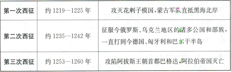 4. 下表为13世纪蒙古三次西征的概况表,下列选项中对此解读不正确的是(