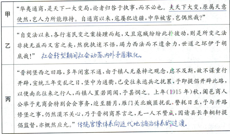 材料二 社会转型是传统因素与现代因素之间的一种张力、一种拉锯,这种张力与拉锯在社会结构的变迁上体现为新旧交替、新旧杂存、新陈代谢的状况,而在历史人物的心灵世界则体现为趋时与怀旧、向往西方与回归传统的交战。