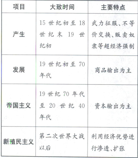 材料 有学者认为,殖民主义是西方列强对非西方世界的一种侵略政策,其目的是最大限度地掠夺财富。他把近代以来的殖民主义划分为以下四个时期,大致时间和主要特点见下表。