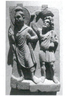 4. 如图为公元 2 世纪印度地区出现的犍陀罗佛教艺术雕像。图中宙斯之子赫拉克勒斯一手握金刚杵,一手持拂尘,身着希腊式服装,以佛教护法神的身份出现在释迦牟尼的身旁。该雕像反映出,人类文明交往(