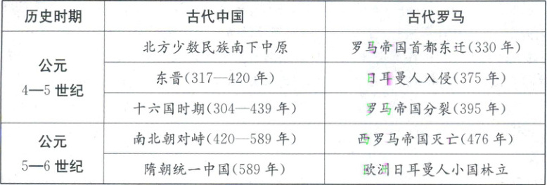 3.古代中国:匈奴内迁,转向定居生活,在中原地区建立政权,促进了民族交融,中原文化部分吸收游牧民族文化因素,促进了民族文化的发展。古代罗马:日耳曼人的迁徙加速了西罗马帝国灭亡,之后西欧进入封建社会,形成以神学、骑士文学和市民文学为主要表现形式的欧洲新文化。