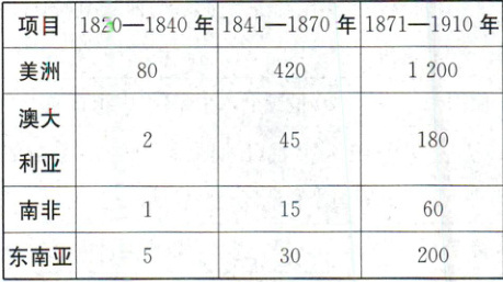 6. 下表所示为1820—1910年欧洲向主要地区移民数量变化情况(单位:万人)。这有助于解释该时期(
