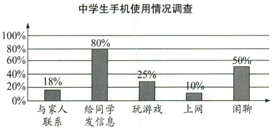 示例:绝大多数中学生用手机给同学发信息,一半学生用手机闲聊,少数学生用手机玩游戏、与家人联系及上网。