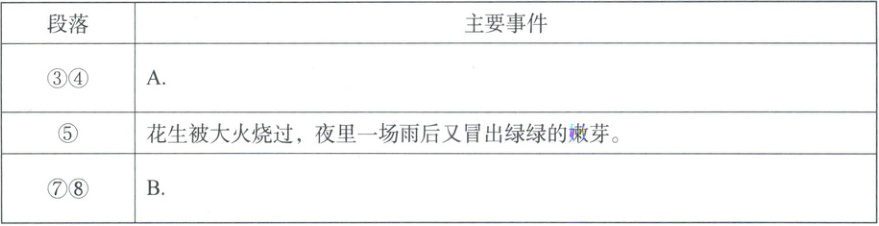 ⑤花生的生命力之强简直让你不敢相信。有一年,麦收过后,邻家图省事,就把田里的麦茬点燃了。谁知火势借着风力殃及我家的地,一地青青,几个小时后,变成了一片黑乎乎的天地。对花生一向自信的父亲脸色煞白,猛地坐在地头,喃喃地说:“完了!这下花生肯定活不了了……”第二天,父亲就去街上重新买了花生种子。没想到,夜里一场雨后,黑乎乎的田里又冒出了绿绿的嫩芽。