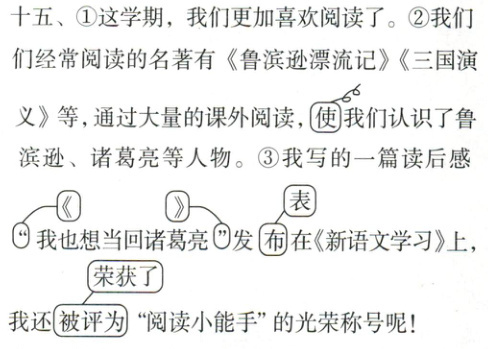 ①这学期,我们更加喜欢阅读了。②我们经常阅读的名著有《鲁滨逊漂流记》《三国演义》等,通过大量的课外阅读,使我们认识了鲁滨逊、诸葛亮等人物。③我写的一篇读后感“我也想当回诸葛亮”发布在《新语文学习》上,我还被评为“阅读小能手”的光荣称号呢!