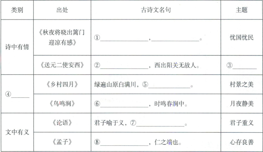 ①遗民泪尽胡尘里 南望王师又一年 ②劝君更尽一杯酒 ③深情送别 ④寓情于景 ⑤子规声里雨如烟 ⑥月出惊山鸟 ⑦小人喻于利 ⑧恻隐之心