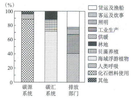 一科研团队以碳循环为研究目标为某岛屿编制低碳城镇发展规划,分别统计了碳源系统(碳的排放来源)、碳汇系统(碳的吸收消耗)和社会各排放部门的碳的流量结构(下图)。该岛植被覆盖率高,年均自然和人为共排放 CO₂ 9.6 万吨,自然生态系统共可吸收 CO₂ 0.7 万吨。