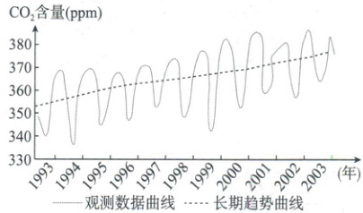 3.B 4.B 解析:3.由图可知,观测数据曲线呈明显的季节性波动,具体表现为CO₂含量夏季低、冬季高,主要是因为西伯利亚地区纬度高,气温低,冬季人们大量燃煤取暖,排放的CO₂多;西伯利亚地区亚寒带针叶林广布,夏季植物的光合作用强,固定CO₂多。 故选B项。4.据图中长期趋势曲线可知,空气中CO₂含量总体呈上升趋势,CO₂含量增加导致的气候变化主要表现为全球气候变暖,全球气候变暖会引起高山的林带上限位置上升,B项正确;全球气候变暖,北半球森林带分布北界会向北扩展,A项错误;高山雪线可能因冰雪融化增加而上升,C项错误;因海平面上升,北部海岸线位置会向南退缩,D项错误。 故选B项。