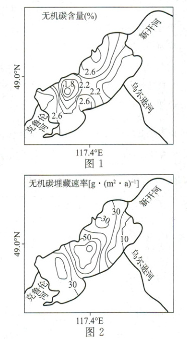 (2025河北保定练习)湖泊无机碳主要以溶解性无机碳的形式存在,但当溶解性无机碳接近饱和时,会逐渐转化为非溶解性物质,被埋藏在沉积物中。呼伦湖是我国北方第一大淡水湖,该区域常年盛行西北风,流域植被为典型的草原。下图示意呼伦湖沉积物无机碳含量和无机碳埋藏速率(单位时间、单位面积内沉积物中埋藏的无机碳质量)。读图,回答1~3题。