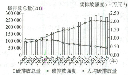 碳排放强度是指每单位国内生产总值的增长所带来的$\mathrm{CO_2}$排放量。随着经济的快速发展,我国能源消耗持续增长,$\mathrm{CO_2}$排放日益增加。我国碳减排任重而道远,各省级行政区碳排放影响因素各不相同,碳减排侧重点应有所不同。下图示意2000~2015年全国碳排放总量、碳排放强度和人均碳排放量。读图,回答4~6题。