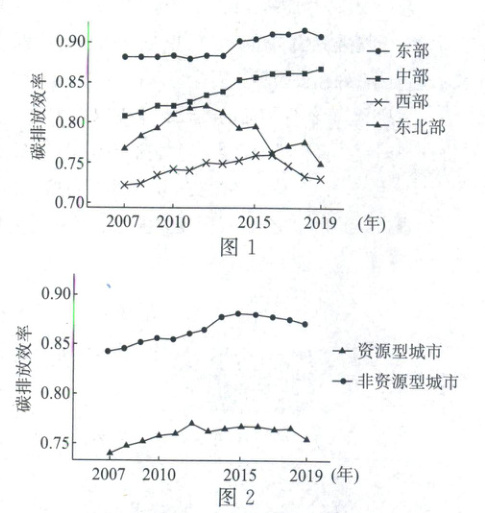 (2025山东济南练习)碳排放效率是指单位二氧化碳排放的实际产出与最优产出之间的比值,其与产业结构、人口密度、对外开放程度、绿色技术创新等因素密切相关。下图分别示意2007~2019年我国不同地区和不同类型城市的碳排放效率状况。读图,回答10~11题。