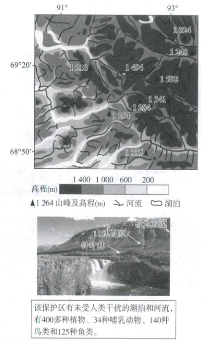 下图为俄罗斯普托拉纳自然保护区的局部地形图及景观照片。