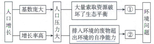 7.D 8.B 解析:7.大量索取资源破坏了生态平衡导致生态破坏;进入环境的废物超出环境的自净能力导致环境污染。 8.即使人口零增长,由于人类世代的无限延续和个人需求的不断增长,仍可能产生环境问题;控制住世界人口的增长,使世界人口稳定在适度规模,成为解决当代环境问题的关键;人口合理增长不会带来环境问题;环境问题的本质是发展问题。