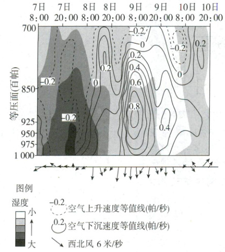 (2023 湖南卷) 大气污染受湿度、大气运动等因素影响。我国某地某月 7 日 8:00 至 10 日 20:00 经历了一次较强的大气污染,PM₂.₅ 浓度变化大。此期间该地空气垂直运动弱。下图示意此期间该地相关气象要素的变化情况(箭头表示对应时刻的近地面风向和风速,帕/秒是气象部门计量空气垂直运动速度的单位)。下列四个时刻,该地污染最严重的是(
