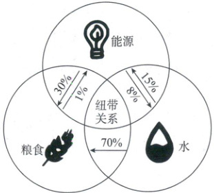 )①能源的开采和消费过程消耗了8%的水资源 ②水资源在提取、处理、运输过程中消耗了15%的能源 ③粮食也可以作为生物质能使用 ④粮食生产需要投入的水资源最多