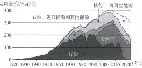 (2025广东惠州练习)2024年9月30日,英国关闭最后一家燃煤电站,结束了140多年燃煤发电的历史。下图为1920~2024年英国的电力结构图。读图,回答3~5题。