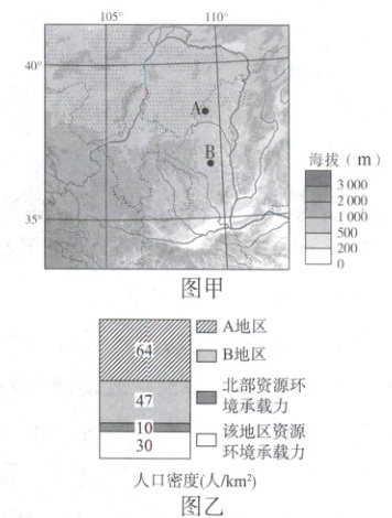 16.B 17.A 解析:16.根据图甲所示信息可知,该地区位于黄土高原,受黄土土质疏松、植被破坏以及夏季多暴雨(降水集中)的影响,该地水土流失现象严重。 17.读图乙可知,该地区的资源环境承载力为 30 人/km²,而目前 A、B 两地区的人口密度已分别高达 64 人/km²、47 人/km²,说明该地区的人口密度已超过该地区的资源环境承载力,从而导致该地区生态破坏严重,造成水土流失问题。